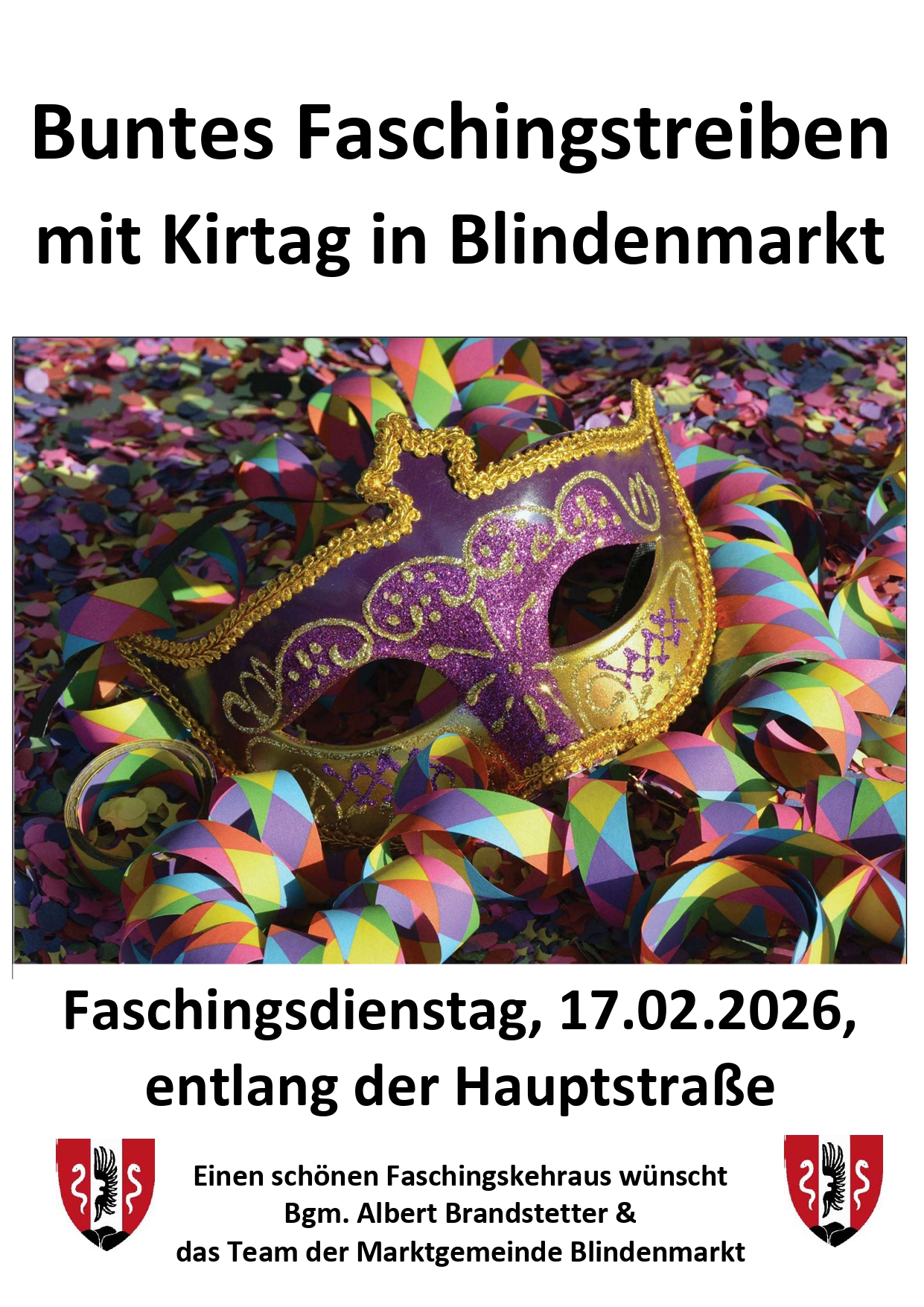 Buntes Faschingstreiben am Faschingsdienstag, 17.02.2026, mit Kirtag entlang der Hauptstraße in Blindenmarkt
