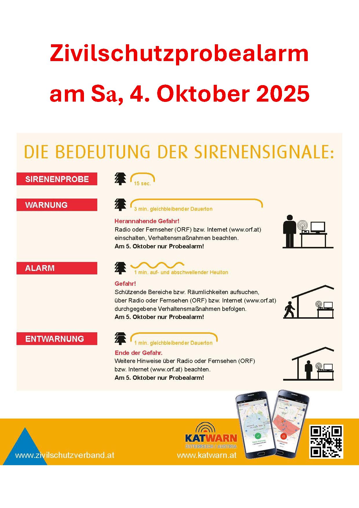 Am 4. Oktober findet der diesjährige Zivilschutz-Probealarm in ganz Österreich statt. Dabei werden die mehr als 8.000 Sirenen sowie AT-Alert ausgelöst. Zwischen 12 Uhr und 12.45 Uhr werden nach dem Signal „Sirenenprobe“ die drei Zivilschutzsignale „Warnung“, „Alarm“ und „Entwarnung“ in ganz Österreich ausgestrahlt. Der Probealarm dient einerseits zur Überprüfung der technischen Einrichtungen des Warn- und Alarmsystems, andererseits soll die Bevölkerung mit diesen Signalen und ihrer Bedeutung vertraut gemacht werden.
