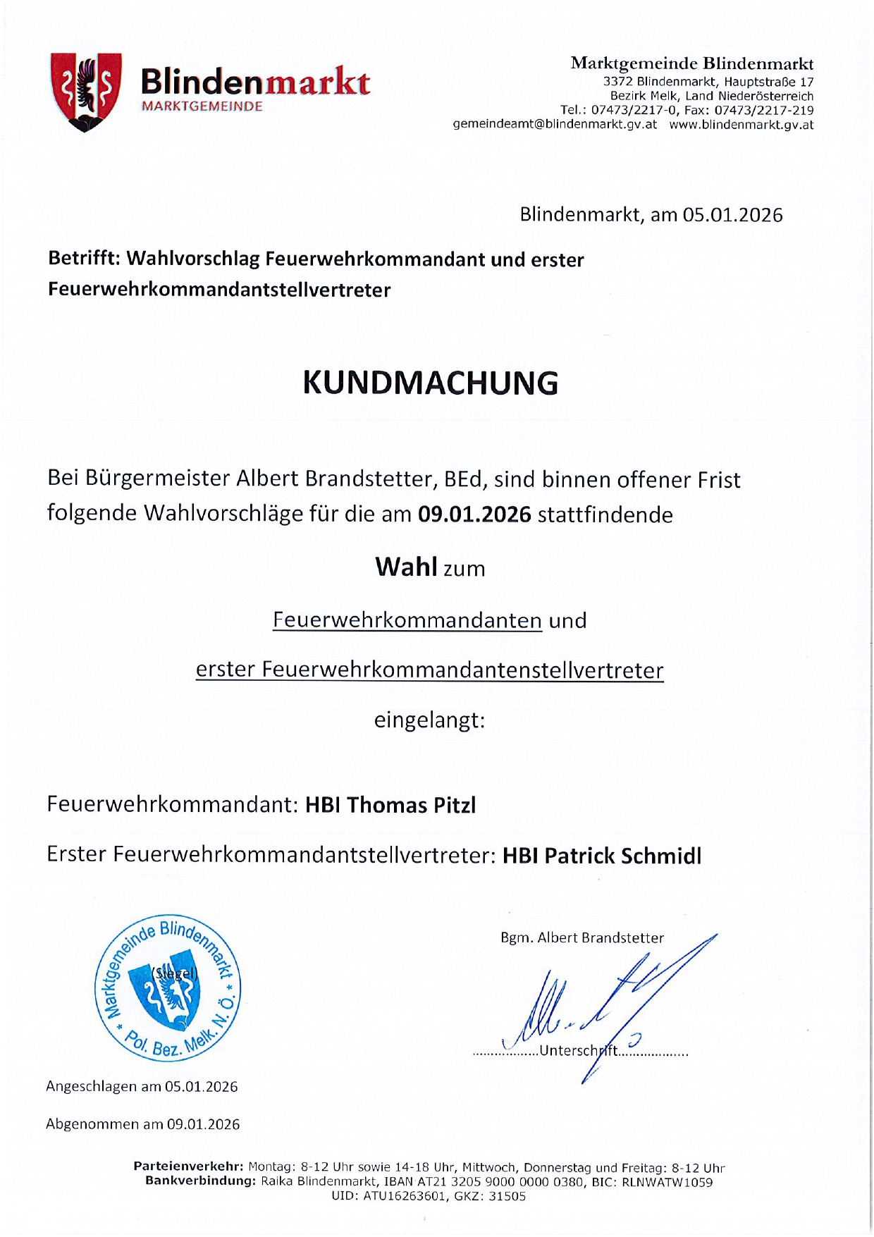 Kundmachung über den Wahlvorschlag "Feuerwehrkommandant und erster Feuerwehrkommandantstellvertreter"
