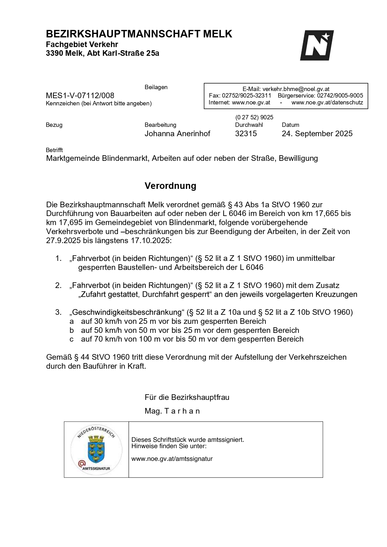 Verordnung BH Melk - Arbeiten auf oder neben der L6046 im Bereich von km 17,665 bis km 17,695 im Gemeindegebiet von Blindenmarkt_24.09.2025.pdf
